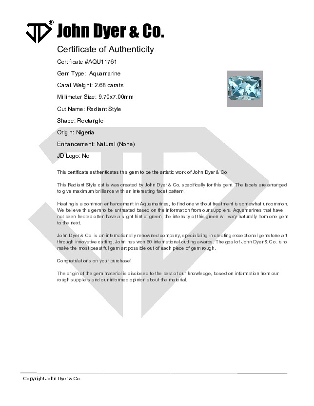 This 2.68-carat Aquamarine gemstone features the Radiant Style cut.