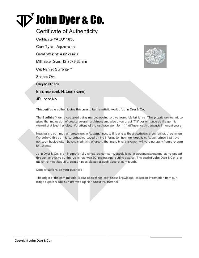This 4.82-carat Aquamarine gemstone features the Starbrite™ cut. Refer to the table below for detailed information about this gemstone.