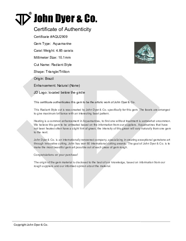 This 4.85-carat Aquamarine gemstone features the Radiant Style cut. Refer to the table below for detailed information about this gemstone.