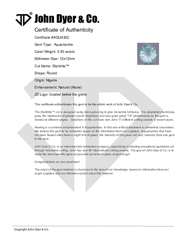 This 5.93-carat Aquamarine gemstone features the Starbrite™ cut.