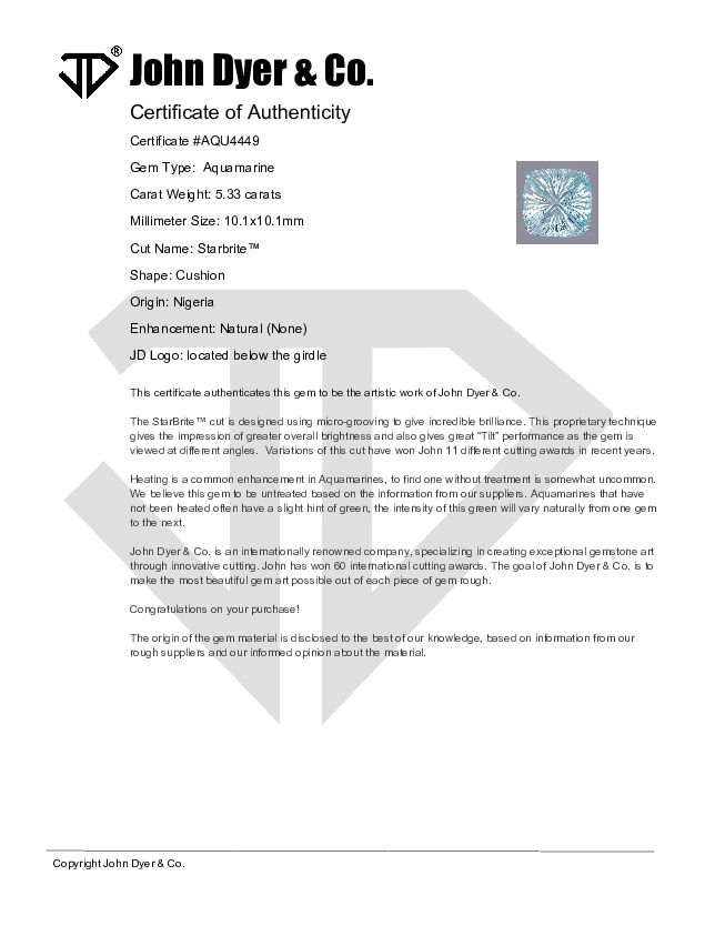 This 5.33-carat Aquamarine gemstone features the Starbrite™ cut. Refer to the table below for detailed information about this gemstone.