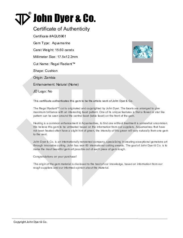 This 15.60-carat Aquamarine gemstone features the Regal Radiant™ cut.