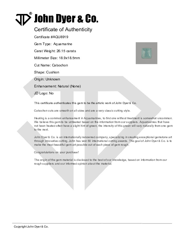 This 26.15-carat Aquamarine gemstone features the Cabochon cut. Very good color aquamarine with inclusions that add to the interest of the piece and make it much less expensive than it would be if it were clean. Refer to the table below for detailed information about this gemstone.