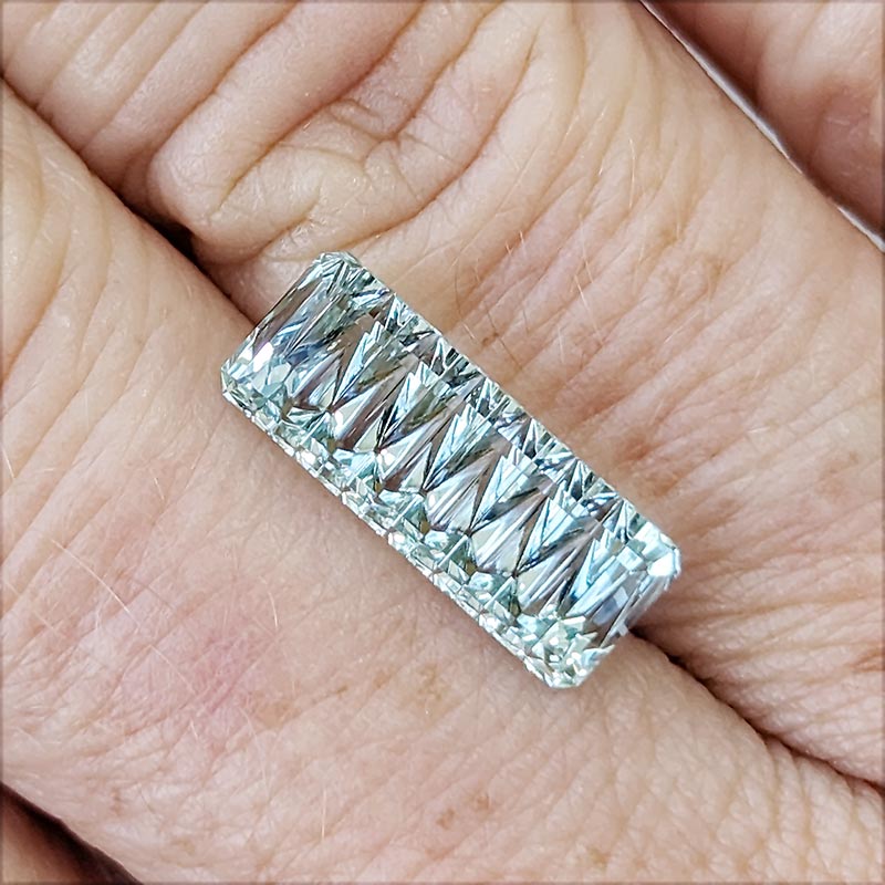 This stunning Aquamarine. The ZigZag™ cut, a blend of geometric facets and dynamic lines, emphasizes the serene blue hues of the gem, echoing the rhythm of waves on a sunlit beach. Framed within a rectangle silhouette, this aquamarine becomes a visual poetry of fluidity and structure.