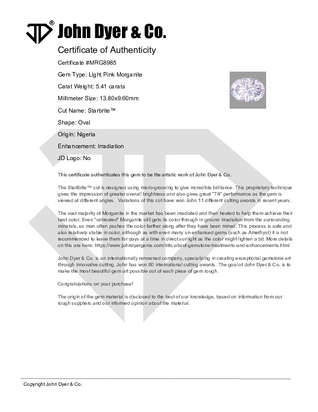 This 5.41-carat Light Pink Morganite gemstone features the Starbrite™ cut. Refer to the table below for detailed information about this gemstone.