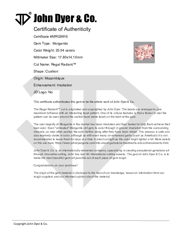 This 20.54-carat Morganite gemstone features the Regal Radiant™ cut.