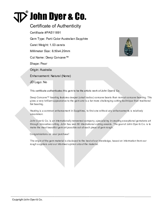 This 1.03-carat Parti Color Australian Sapphire gemstone features the Deep Concave™ cut. Mined in the Central Queensland Gemfields. Refer to the table below for detailed information about this gemstone.