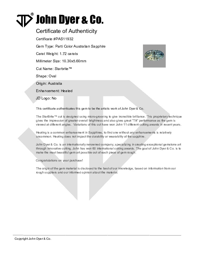 This 1.72-carat Parti Color Australian Sapphire gemstone features the Starbrite™ cut. Refer to the table below for detailed information about this gemstone.