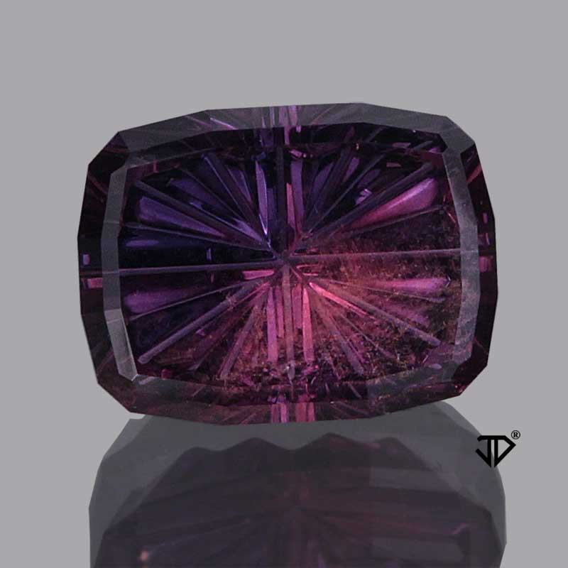 This 2.26-carat Parti Color Sapphire gemstone features the Starbrite™ cut. This mysterious rich purple/blue/pink gem with maybe even a hint of orange has an intriguing mix of colors which will shift a bit from one kind of lighting to another. Also since it is natural color it has an undissolved cloud of golden tinged rutile needles that look like a constellation under magnification when the light is shown in just the right direction. There is a photo I took while polishing the gem that shows this constellation magnified and it is both beautiful and fascinating to look at. Our cutting and natural color, other than the interesting rutile "constellation" this gem is quite clean. The picture on gray background was taken in Incandescent light and picture on hand and video were taken in Fluorescent lighting. Some color shift from one kind of light to another is one of the cool features of natural sapphire.