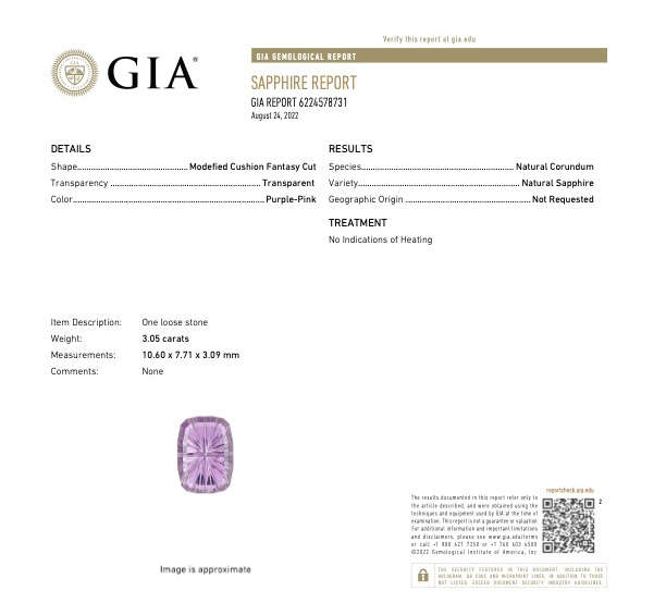 A rare large size purple pink cushion shaped sapphire with our designer cut which gives the gem lots of brilliance while allowing it to be shallow which means that you can set it very low in a ring. Accompanied by a GIA lab report stating "No Indications of Heating".