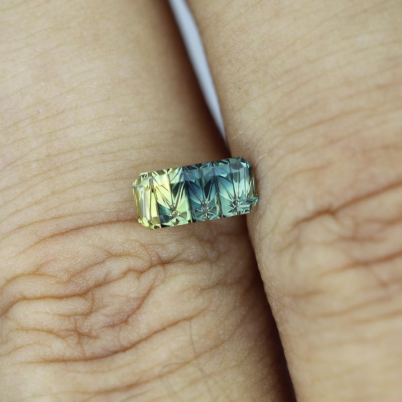 Rectangular parti color Australian sapphire with John's unique ZigZag cutting style and great clarity.
