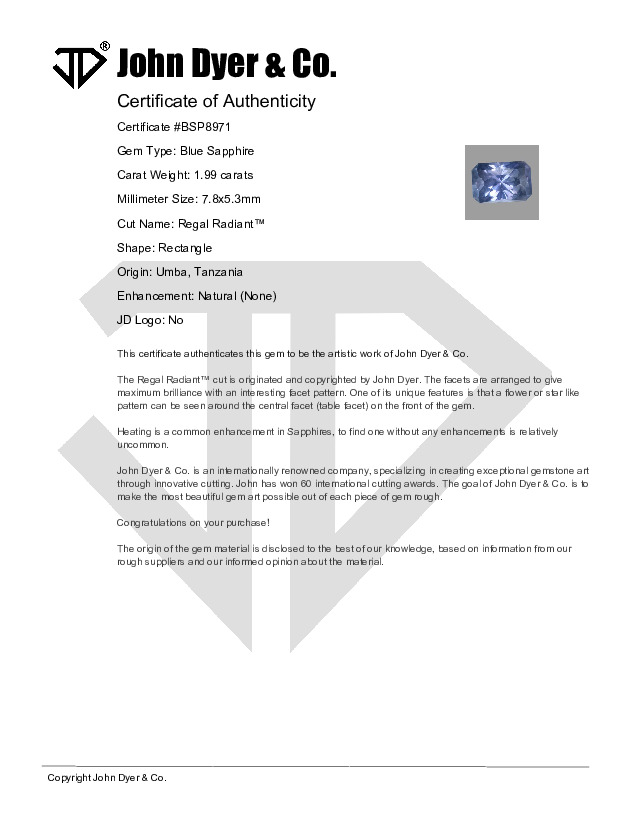 This 1.99-carat Blue Sapphire gemstone features the Regal Radiant™ cut.