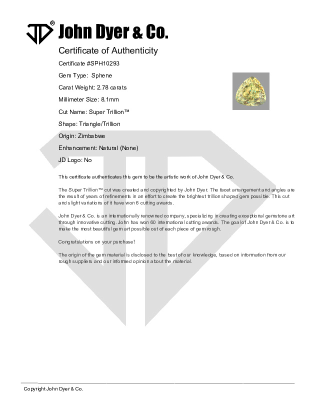 This 2.78-carat Sphene gemstone features the Super Trillion™ cut. Refer to the table below for detailed information about this gemstone.