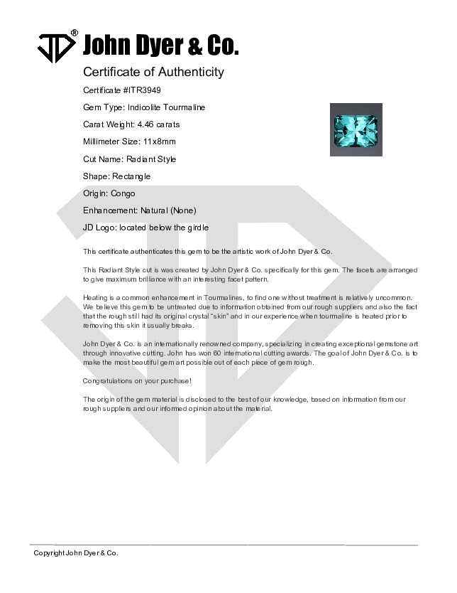 This 4.46-carat Indicolite Tourmaline gemstone features the Radiant Style cut.