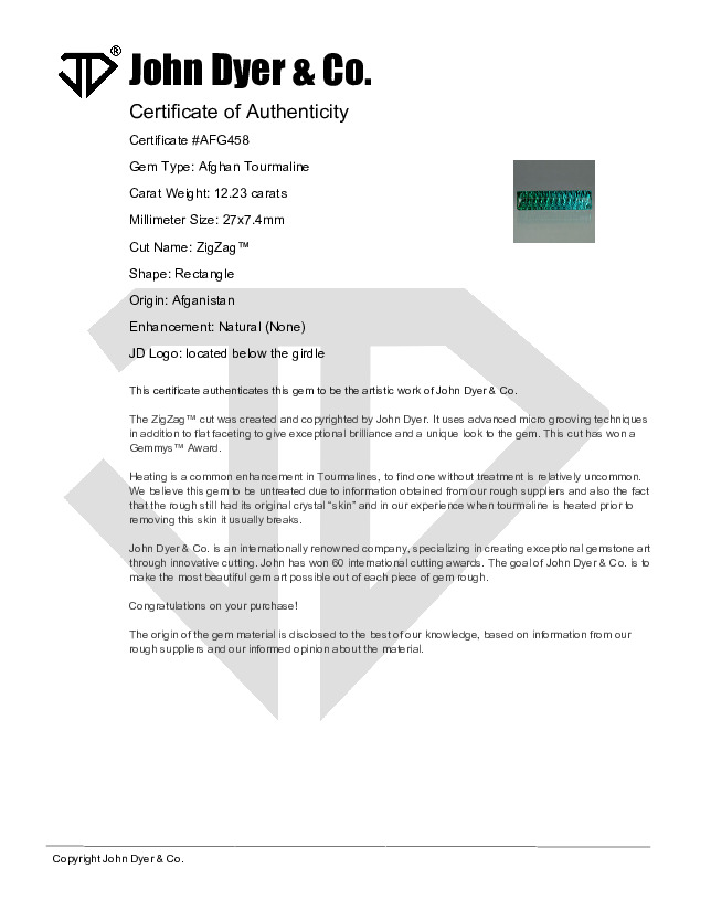 This 12.23-carat Afghan Tourmaline gemstone features the ZigZag™ cut. Refer to the table below for detailed information about this gemstone.
