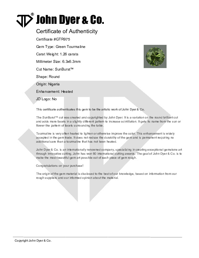 This 1.26-carat Green Tourmaline gemstone features the SunBurst™ cut. Refer to the table below for detailed information about this gemstone.